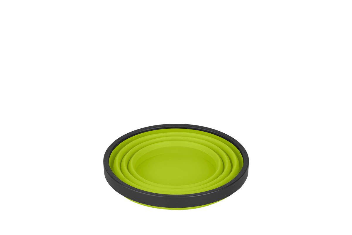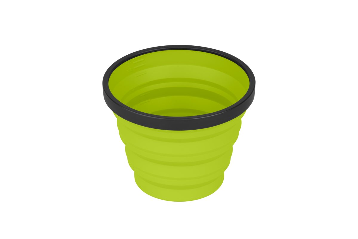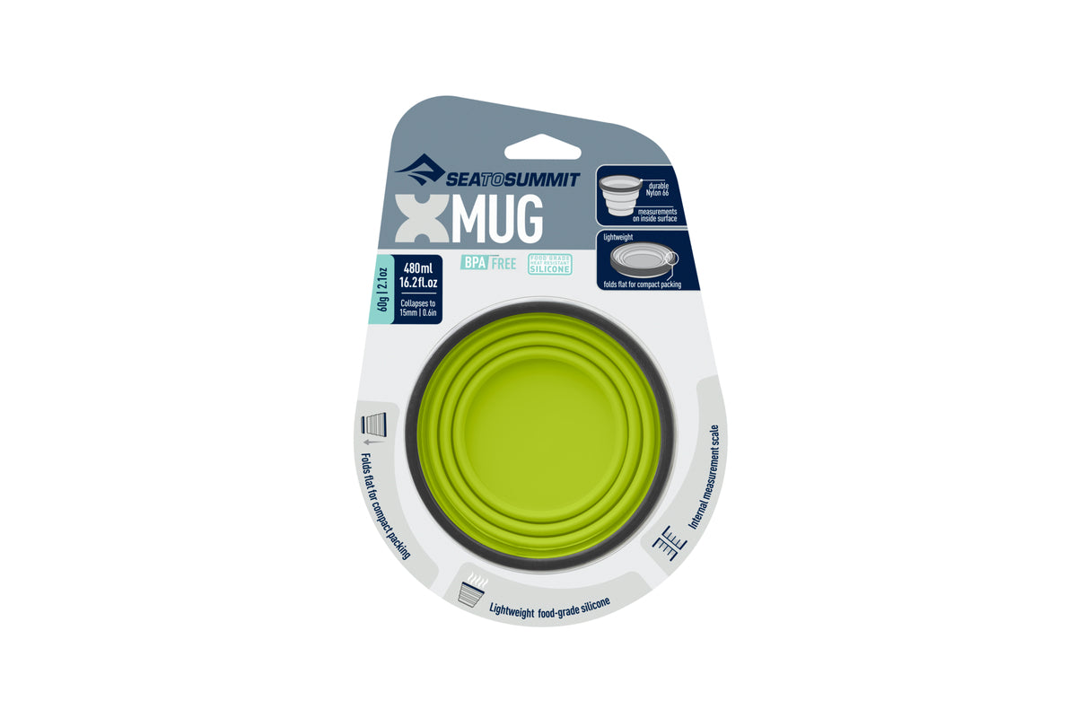 The X-Mug is a collapsible camp mug with a 480 ml capacity that is also calibrated as a measuring cup. The food-grade, flexible silicone sides collapse making it a small compact disc sized dinnerware piece that nests neatly with other X-Series dinnerware and X-Pots, while the rigid ring creates a sturdy drinking vessel and prevents scalded fingertips.
